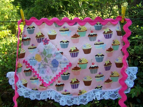 If you like pink, this is your apron. The cupcakes really set off this womens apron. A long bright pink rick rack tie on this waist apron. The pocket is a vintage hankie and trimmed with pink rick rack, has an extra embroidery flower on top. The bottom of this half apron is scalloped with light pink lace. Pretty apron and nice fit. 100% original. Could either be a womens apron or a young girls fun apron. Check out sizing. Enjoy and me-wow