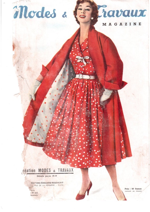 Modes & Travaux was (and amazingly still is) a French women’s magazine with lots of great advertising, articles on haute couture, travel, books, cooking, fashion, children, home-making, and all sorts of home crafts (needlework, sewing, embroidery, crocheting, knitting). It commenced publication in 1920 and is still doing so. One or more patterns were included so you could make one of the garments illustrated in the issue, also a pattern for embroidery or something similar, and often a “supplement” with an article about something of interest, an author, etc. It was printed on rather poor quality stock, only one step above newsprint, so these old magazines have flaws, stains, creases, etc. They are an excellent source for vintage fashion illustrations, and for a glimpse into the everyday life of the average homemaker of the period. Of course, it is all in French!