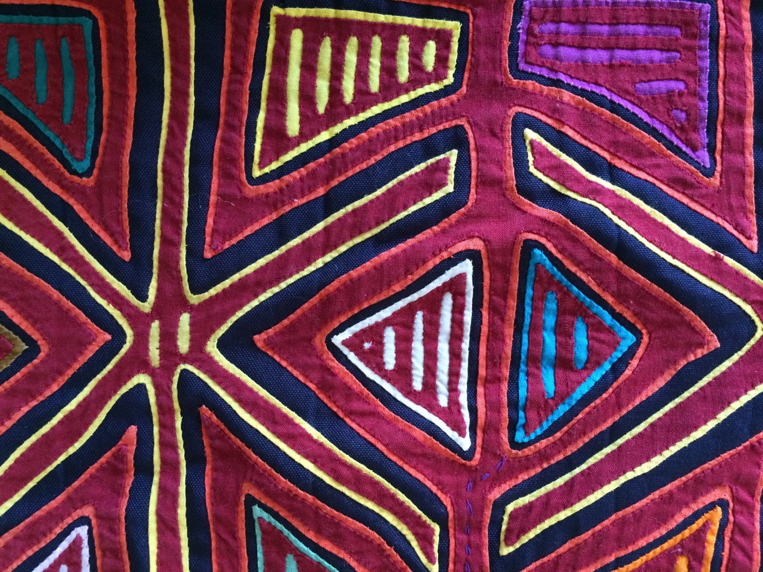 KUNA CLOTH throw pillow. MOLA abstract folk design crafted into a throw pillow. The pillow appears to have been created in the 70s (based on metal zipper), no dating available on the MOLA. Geometric design, classic red with yellow, white, blue, orange, brown. Back of throw pillow in blue linen fabric, zips shut with metal zipper (round handle typical of the 70s and/or late 60s).
