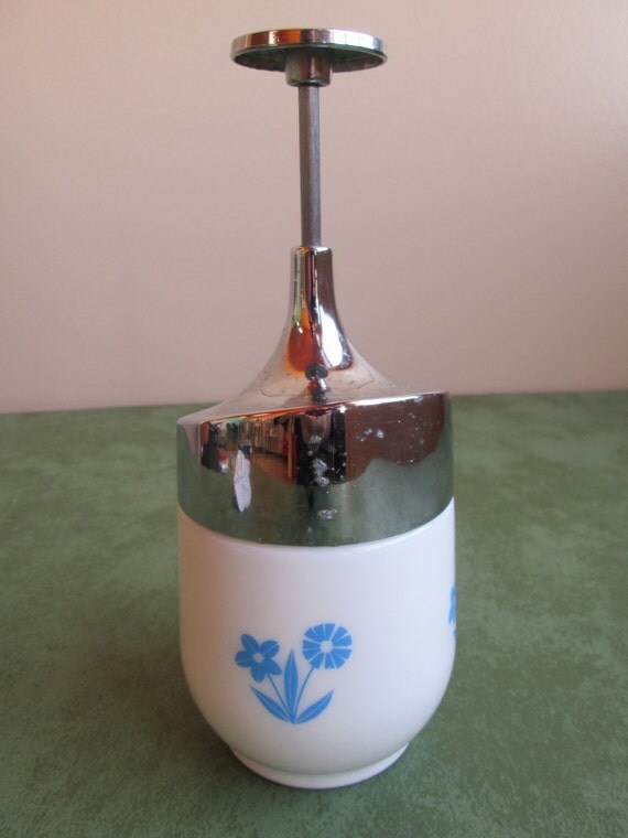 Love these Gemco kitchen products. Push down on the spring loaded handle & chop away. The milk glass jar is in excellent condition. The chopper lid is in perfect working order but does suffer from some pitting of the chrome finish. (see pics) 9 '' high x 4" wide at the widest point.