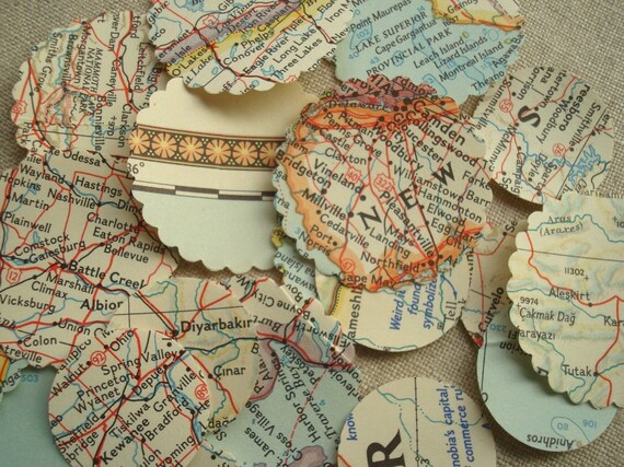 I hand-punch old vintage maps and atlas pages into scalloped and round shapes to create sticker seals. In soft, natural colors of land and sea, they add vintage embellishment to scrapbooks, envelopes, folders and notebooks.