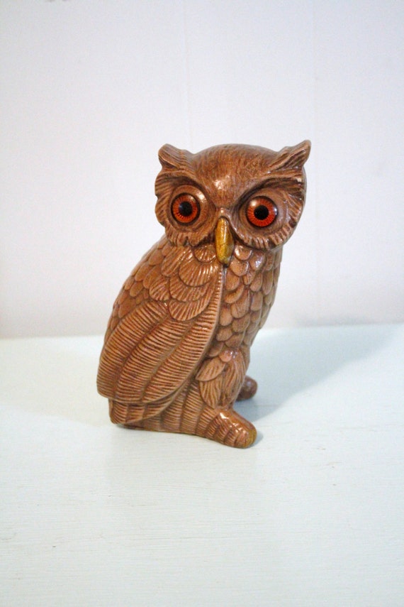 Here is a great chalk owl from 1974. He has unusual orange plastic eyes and is filled with sand which means he could have been a door stopper or a large paper weight. He may have been hand made because he is initialed on the bottom and marked "1974". He has no breaks but one of his eyes has a very small scratch as shown in the 4th photo.
